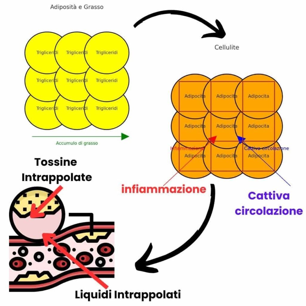 La cattiva circolazione altera il tessuto connettivo rendendolo più rigido e fibroso intrappolando le cellule adipose e creando le tipiche protuberanze e depressioni visibili sulla pelle