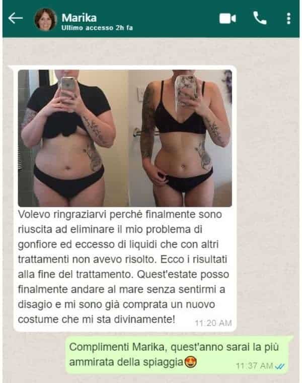 Volevo ringraziarvi perchè finalmente sono riuscita ad eliminare il mio problema di gonfiore ed eccesso di liquidi che con altri trattamenti non avevo risolto. ecco i risultati alla fine del trattamento. Quest’estate posso finalmente andare al mare senza sentirmi a disagio e mi sono già comprata un nuovo costume che mi sta divinamente.