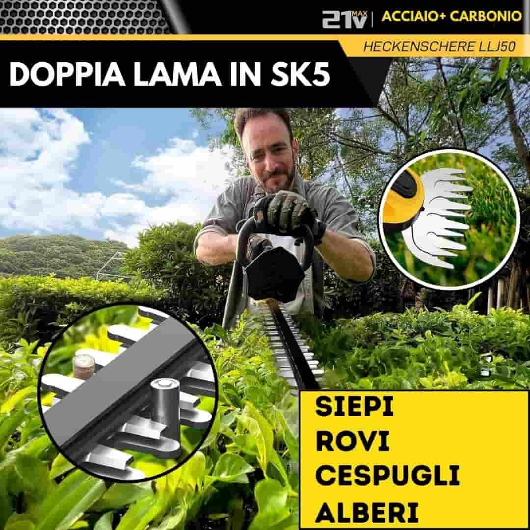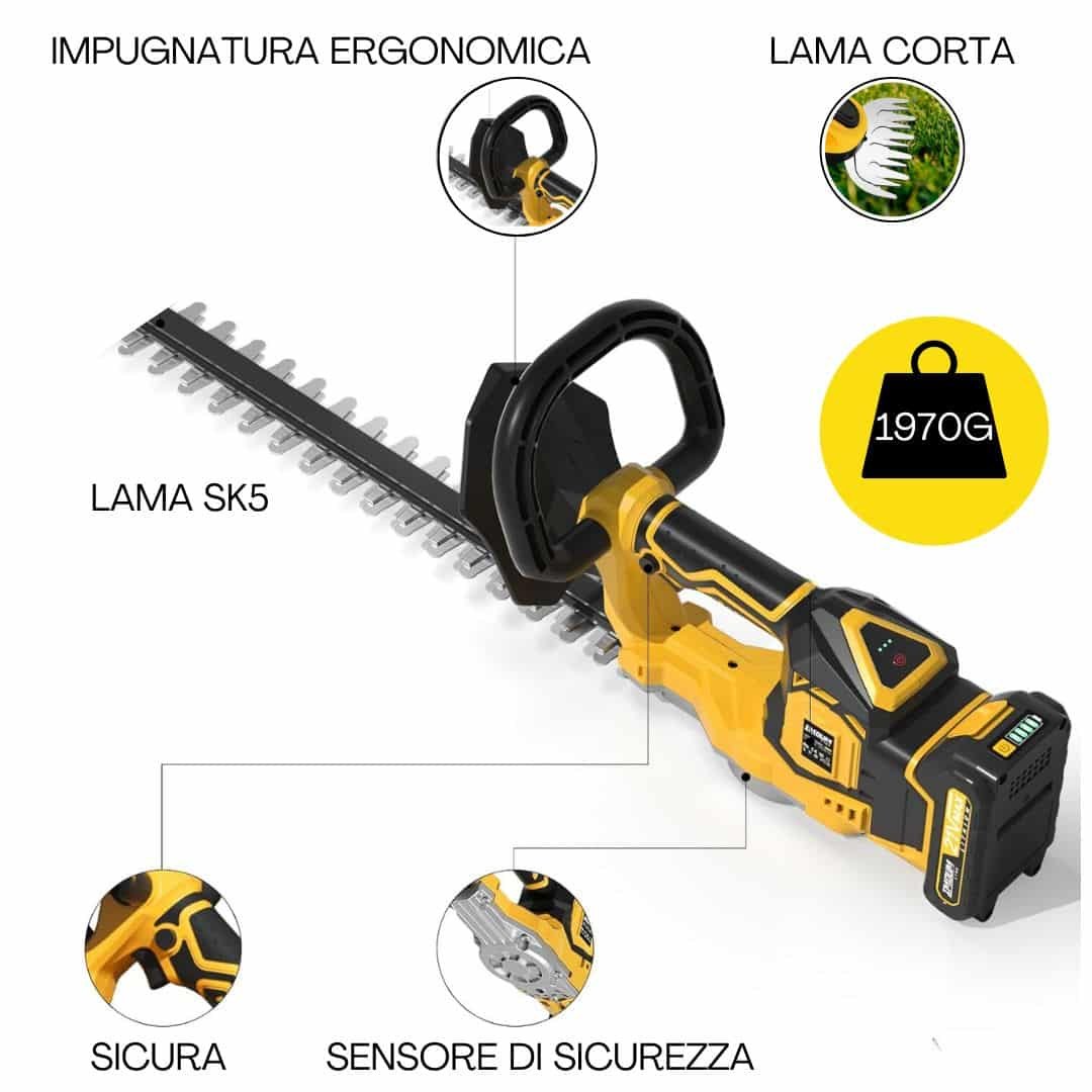 Grazie alla Lama da 61 Cm in Acciaio SK5 Temprato auto-lubrificata a doppio taglio rettificate al diamante e tagliate al laser ottieni siepi perfette in un solo passaggio, effettua tagli netti ed estremamente precisi Per Potare, Accorciare e Modellare con Facilità e Precisione Siepi, Alberi e Arbusti. Il suo design Leggero(solo 1,3kg) ed Ergonomico riduce dell’84% la fatica su Mani, Braccia e Collo.