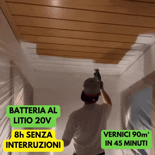 Vernicia 250 m² in soli 45 minuti, con la batteria al Litio da 48V lavori fino a 8h senza interruzioni e ricarica rapida in 30 minuti. PowerJet UltraMax è leggero (850gr) e Maneggevole grazie al suo design compatto ed ergonomico che si adatta perfettamente alla tua mano. Questo ti permette di lavorare comodamente per ore senza sforzi e fatica.